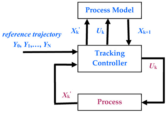 In this section, we propose a statement for a new problem that will allow us to show what it does mean to reproduce the state trajectory (2) to a certain extent. Let us note that, because of the terminal penalty, our desideratum concerns only the final state of the process. It is suitable that the latter one is nearly identical to . Consequently, the OCP’s performance index J will be almost equal to . However, this objective is not reachable in most applications. It may need an N-step ahead prediction that is a huge, time-consuming process. In this case, the best we can do is maintain the entire state trajectory in the reference trajectory’s neighborhood, as close as possible. The controller will use only one-step-ahead predictions. That is why we may call the control structure from Figure 1 a tracking structure. The input data are a reference trajectory that must be followed up as much as possible by the sequence of its state variables. This pursuit is generated by the tracking controller (TC) that acts in a manner adapted to this purpose. The control inputs’ values are optimally determined for all sampling periods, as explained below.