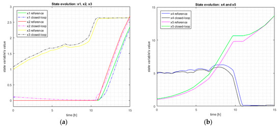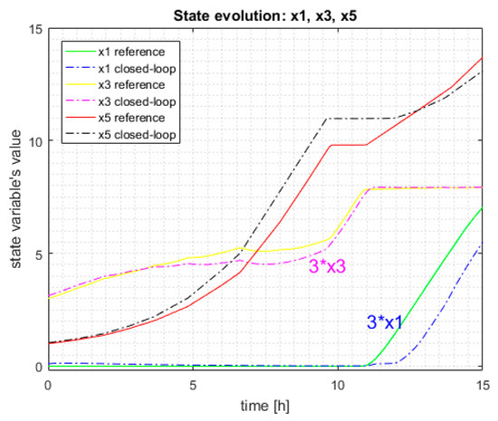 Figure 8 presents the comparative evolution of the state variable x1, x3, and x5 in the two cases: the reference trajectory and the closed-loop system with TC using EA2. The values of x1 and x3 are multiplied by 3, to render distinguishable the 4 curves.