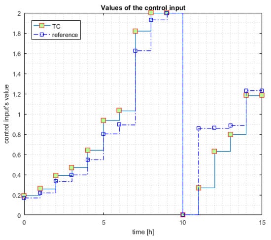 The discrete control input yielded by the TC is depicted in Figure 7. The evolution’s pattern is similar to a large extent to that one presented in Figure 5.