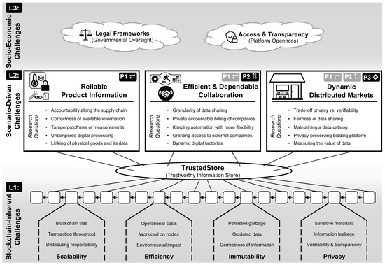 We group our research towards accountable and dependable manufacturing into three layers (from bottom to top). L1: Blockchain-inherent challenges that concern the properties of blockchain technology, which is expected to serve as an underlying key component of our envisioned TrustedStore. L2: Scenario-driven challenges that can be grouped into three main research directions that each focus on a specific research pillar, i.e., along supply chains (P1 ⇄), across supply chains (P2 ⇅), and situations with insufficient trust between stakeholders (P3 ❖). L3: Socio-economic challenges that have an impact on underlying collaborations and improvements. To offer viable solutions for accountable and dependable manufacturing, research must consider and tackle all layers and their individual research challenges.