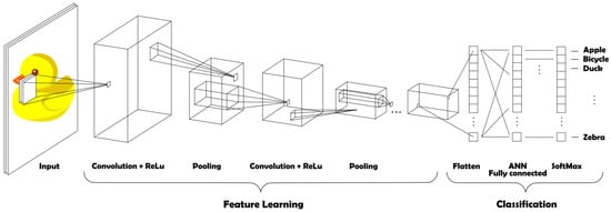 CNN process for an image classification problem: in the Feature Learning part, several convolutional layers alternate with pooling; in the Classification step, a fully connected ANN is used to define the output of the process (adapted from [14]).