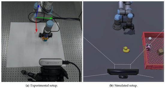 The proposed system consists of a UR3e collaborative robot equipped with a two-finger gripper and a fixed RGBD camera positioned in front of the robot pointing to the working area. A top-view of the setup is depicted in Figure 3, which shows the experimental setup (Figure 3a) and the corresponding simulation setup (Figure 3b). In both cases, the cobot is at the top of the image, and the camera is at the bottom.