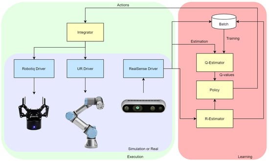 The system architecture, shown in Figure 4, is divided into a Learning side (right) and an Execution side (left). In the learning side, it uses DQN to estimate the Q-values in the Q-Estimator. Actions to be taken by the robot are defined by the RL Policy. The action space is defined as coordinates for the gripper and the Q-values correspond to estimate probability of grasp success. The acquisition of experience can be accelerated in simulation, so the execution side was designed to work with both simulated environment and real hardware, for data collection, learning, fine tuning and evaluation. Robot Operating System (ROS) topics and services are used to transmit data between the learning side and the execution side. In the execution side, the boxes shown in blue are the ROS drivers, necessary to bring the functionalities of the hardware to the ROS environment. Each software module can have multiple nodes and communicate with multiple topics and services. The modules Q-Estimator, R-estimator, Policy and Integrator were written in Python as ROS modules to access the camera and the cobot. The Q-estimator module was developed using PyTorch [35] to build the DCNN to estimate the Q-values. The architecture of the DCNN was designed based on similar object detection solutions, such as in [17,18,19,21]. The Integrator converts the policy output into commands for the cobot. It identifies if the environment being controlled is real hardware or simulation and makes the proper adjustments. The Integrator is responsible for connecting all modules, simulated or real. It controls the simulation using the Supervisor API and feeds the RGBD images to the neural network. All modules were developed in Python and are available on GitHub [36] as a ROS package.