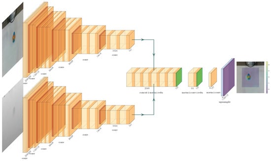 Figure 5 shows the pre-trained CNN models as DenseNet for illustration purposes. In this work we used four pre-trained CNN models to compare their performance: DenseNet, MobileNet, ResNext and MNASNet. For each case, both pre-trained CNN models in Figure 5 were replaced by the new pre-trained CNN, while the rest of the system remained the same. The goal was to compare their computational performances in order to select the most efficient one for our case. The use of pre-trained models reduces the overall training time. However, it brings limitations to the system: the size of the input image must be 224 by 224 pixels and the image must be normalized following the original dataset mean and standard deviation [38]. In general, this limits the working area of the algorithm to an approximately square area.