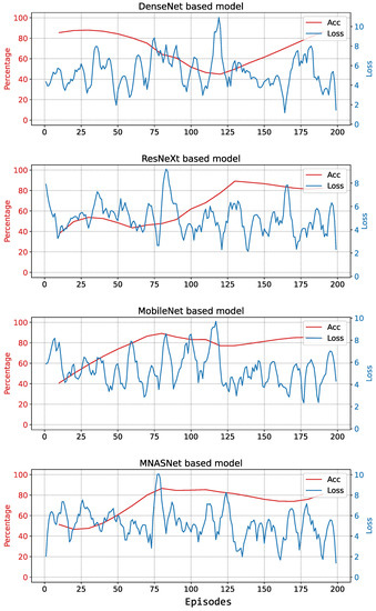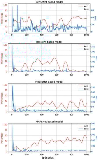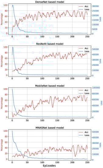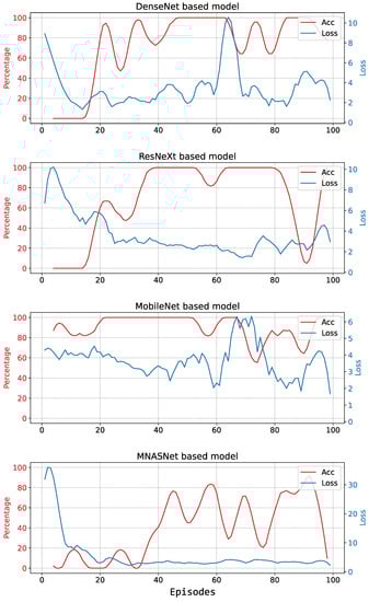 The evolution of loss and accuracy during training is shown in Figure 7 for DenseNet, ResNext, MobileNet, and MNASNet. It can be observed that for all models the loss approaches zero and remains low, while there is no sustained improvement in accuracy. This means that the algorithm cannot learn and the resulting estimated Q-values are poor.