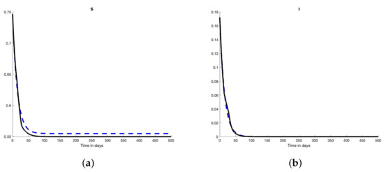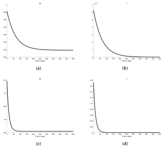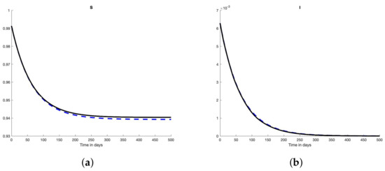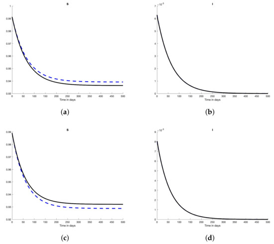 Figure 4. Scenario 2: States. (a) : S and (- -); (b) : I and (- -); (c) : S and (- -); (d) : I and (- -).