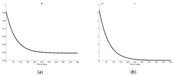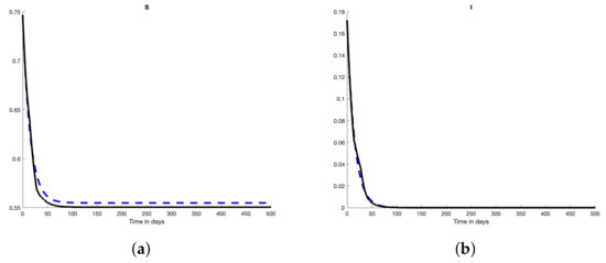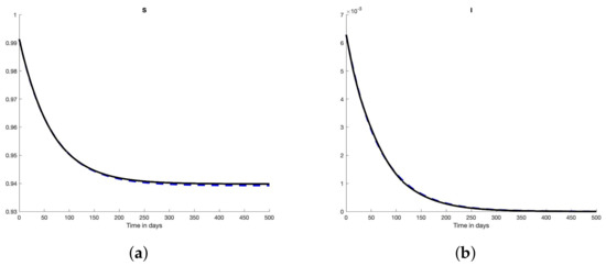 Let us first assume that and are perfectly known. This initial time 0 is set after 35 or 45 days of epidemic spreading, where . Thus after 35 days is less than after 45 days. Figure 1 and Figure 2 display excellent results, where . Note that, even here, closed-loop control is necessary in order to counteract the unavoidable rounding errors.