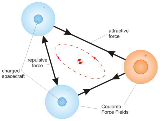 - Berryman, J.; Schaub, H. Analytical Charge Analysis for 2- and 3-Craft Coulomb Formations. AIAA J. Guid. Control Dyn. 2007, 30, 1701–1710. [Google Scholar] [CrossRef]
