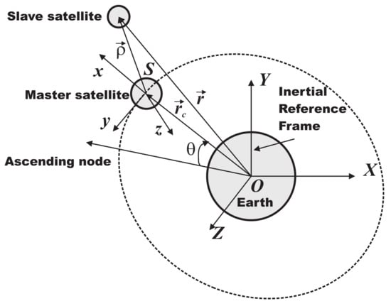 Based on the constraints imposed by the decorrelation of the SAR phase in oceanographic applications for extended baselines, in [] the upper limit of the relative baseline along the path of the spacecraft formation is 50 ms GHz , which is about 300 m in the L-band and 40 m in the X-band. (Recall that L-band: – GHz, X-band: – GHz.) To provide a margin of accuracy with respect to the decorrelation threshold, the appropriate separation of spacecraft in the formation along the trajectory would be m in the L-band and m in the X-band. There are two main options for controlling a formation: ground-in-a-loop control and autonomous formation control. Obviously, in the second case, information is required on board the spacecraft about their relative position and speed. To the relative position of the two spacecraft prediction, it is necessary to integrate the equations of their motion taking into account all relevant perturbations, including the effects of a complex form of the Earth’s gravitational field, the influence of the Sun, and the Moon, atmospheric drag and solar radiation pressure []. For the motion of two spacecraft in the limiting case of near-circular orbits and close formations (with a distance of less than 1 km), closed forms of the Clohessy–Wiltshire equations of relative motion [] can be obtained.
