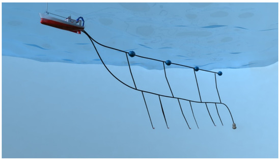 The extent to which bottom trawling impacts the marine environment continues to be debated [9,10,11]. Both the scale of trawling impacts and the ecological effects have been highlighted, suggesting that bottom trawlers cover an area equivalent to perhaps half of the world’s continental shelf each year [10]. A robust quantification of the distribution and intensity of bottom trawling provides a source of evidence to assess the pressure on seabed habitats, compare the impacts of different fisheries, characterize the fishery, and estimate the extent of unfished areas outside marine protected areas (MPAs) and fishing regulations [12,13,14,15,16,17]. An overview of the trawl fishery is shown in Figure 1. This paper focuses on improvements, especially in the technical aspects. In trawling, fish are detected by a fish finder and traps are lowered to the location of schools of fish. Lowering traps to the location of fish while maintaining a constant speed is conventionally performed manually and requires skill, especially in lowering traps at low speeds. This paper describes the automation of this process in order to reduce labor shortages in the fishing industry and improve fishing efficiency through technological improvements.