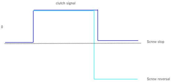 Figure 9 shows the results of the comparison with the step-up model. When the time constant is 10 s and the wasted time 3.5 s is compared with the wasted time 4.0 s, the wasted time 3.5 s seems to be more consistent with the model. Figure 10 shows the results of step descent. The dark blue graph shows the measured data, yellow shows the measured data plus 1 s, and pink shows the simulated data. In addition to the fact that it was found that the rise model can approximate the fall data as well, and given that the rise model is used more often in real data, the rise model is utilized in this paper. Figure 11 shows the results of the simulation comparison of ramp inputs. Dark blue represents the simulation results, pink represents the real data, and yellow represents the DA values. Light blue shows the values when the screw is reversed.