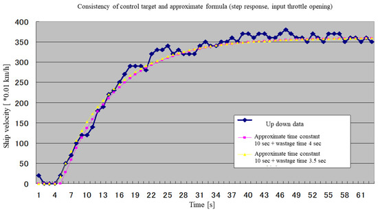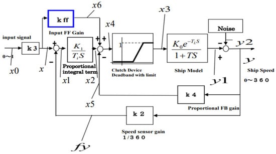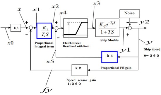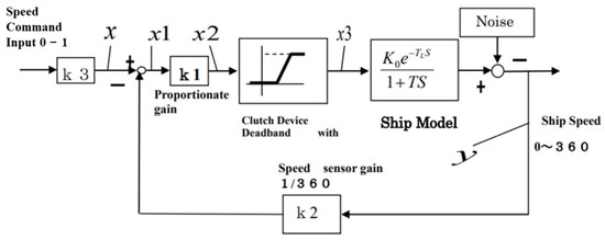 The model was created based on the experimental results of the speed step response of a ship in open loop. Since no oscillation was observed, the model was approximated by a first-order delay plus wasted time. The model is shown in Equation (1), where TL = wasted time, T = time constant, and k0 = proportional gain.
