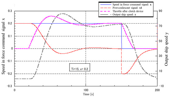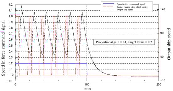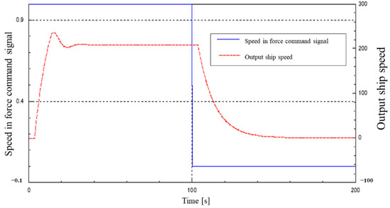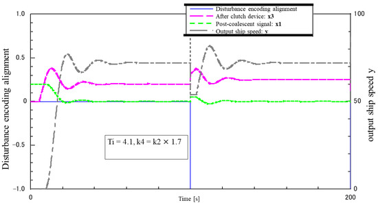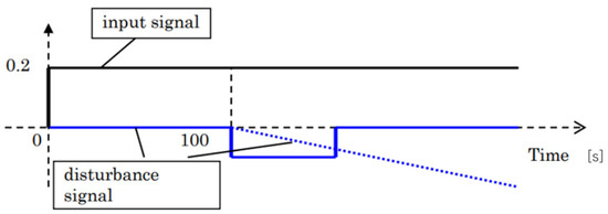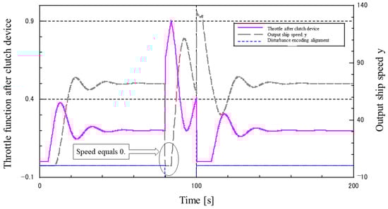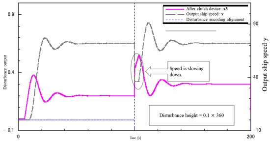 Figure 23 and Figure 24 show the results of including a step-like disturbance (no lowering) of varying magnitude in the I-P control system. In the model, 0.2 times the maximum speed was continuously input as the target value, and disturbances of 0.05 and 0.1 times the maximum speed of the ship were input after 100 s. The disturbance was applied 100 s later. After the disturbance, the speed dropped and the waveform was disturbed, but it was observed that the speed returned to the target value.