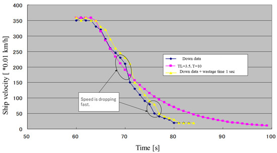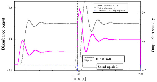 Figure 26 shows the results of inputting a step disturbance (with lowering) at the same speed as the ship, but only between 80 s and 100 s. When the disturbance is large, there are times when the speed drops to zero even when the disturbance acts for 20 s. The waveform is also greatly disturbed.