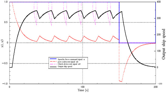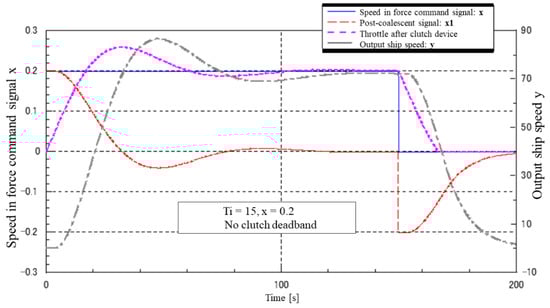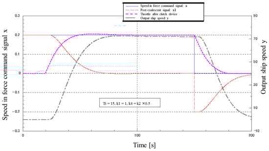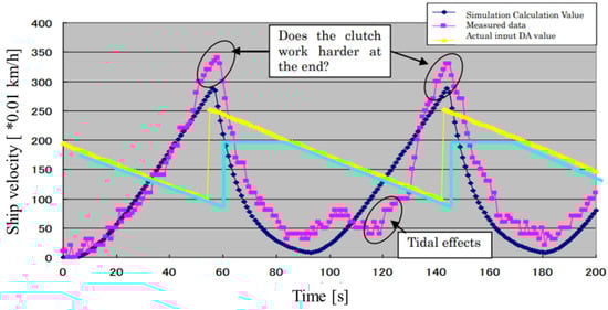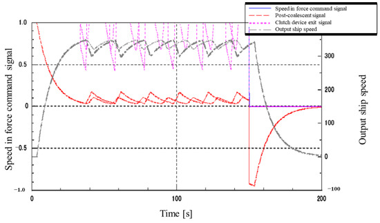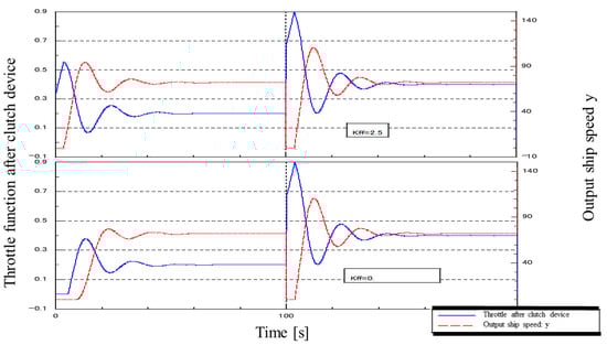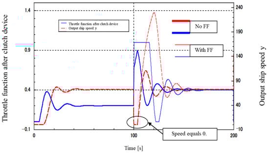 Figure 28 shows the superimposed waveforms with and without the disturbance FF. With the disturbance FF, the clutch signal reaches its maximum value at a high speed because the disturbance signal is fed directly into the clutch. However, there is no change in the time when the ship comes to a stop, perhaps due to wasted time, and the subsequent waveforms oscillate more significantly with FF. The above results show that the addition of the disturbance FF did not have any effect on the disturbance.