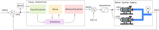 The structure of the fuzzy controller is depicted in Figure 2, whose goal is to generate control actions to modify the value of the dynamic pressure response at the system output. The control is of the SIMO (single-input multiple-output) type, with P representing the control variable (pressure). The current error is represented by , which is the reference pressure value. ; is the error variation given by ; is the actuation signal increment or decrement (speed of rotation of the pump set). The last value of the frequency used for actuation is , and the updated value of the frequency of the inverter, which is used as an actuation variable on the motor pump, is . A saturator was used in this diagram to prevent the motor pump from operating outside of its operating range.