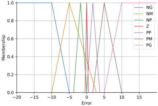 The membership functions of the controller input variables are shown in Figure 3 and Figure 4. The input linguistic variables could have seven different values: negative big (NB), negative medium (NM), negative small (NS), zero (Z), positive small (PS), positive medium (PM), and positive big (PB). Numerical boundaries for each category were defined considering prior knowledge of platform behavior, and the membership functions chosen were triangular and trapezoidal.