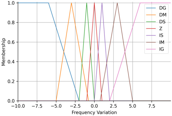 The membership functions of the fuzzy control output variable is shown in Figure 5. The determination of these functions is based on the acceleration ramp of the frequency inverter used to drive the pump set, which has a maximum rotation frequency of 4 Hz. Decrease small (DS), decrease medium (DM), decrease big (DB), zero (Z), increase big (IB), increase medium (IM), and increase small (IS) are the linguistic variables of the output.