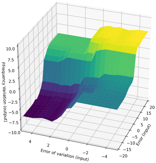 - Saturation region: with values equal to ±6 Hz, the surface has two saturation regions (negative saturation in blue and positive saturation in yellow). When the error or/and frequency variation are far from zero, the system output reaches these values.