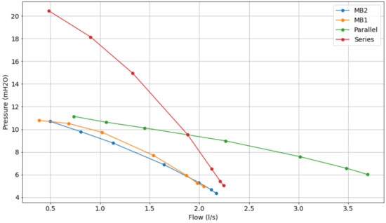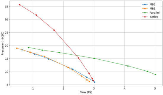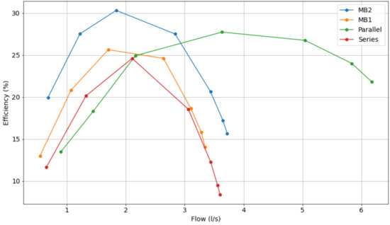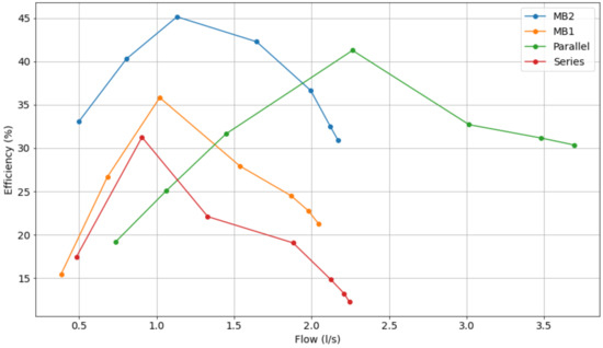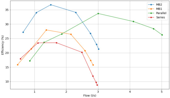 Selecting the flow values mentioned in the previous paragraph in the curve of Figure refcurve04, one can determine the corresponding yield, as follows: 35% (MB 1), 42.5% (MB 2), 23% (parallel) and 30.5% (series). Note that the efficiency of pump motor set 2 is the highest, so the system will operate using this configuration.