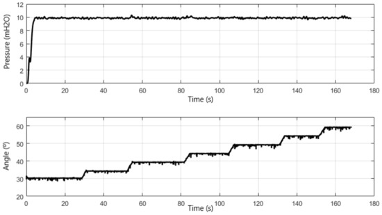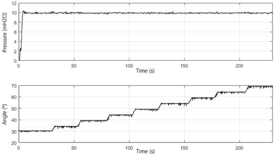 The energy efficiency of the controlled system for different setpoints was finally evaluated. For this, we considered the motor-pump set starting with rotation speed equal to zero, the angle of the control valve (VRP) equal to 35°, and the initial desired value equal to 8 mH2O. After that, this value was incremented with a step of 2 mH2O until reaching 14 mH2O, then decremented with the same step, until reaching 8 mH2O again. These results are illustrated in Table 6.