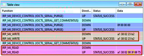 Figure 5 highlights in a red box a set of Hex Codes which stood out. IRP_MJ_WRITE Code with data column record 0x [A1 38 02 23 B2], for example, appeared immediately before the IRP_MJ_READ, which is a Serial Temperature Read command on which we can find the temperature 63 °C (encoded as 0x [00 3F]), Highlighted in the yellow square. This reading was confirmed by the provided software’s user interface.