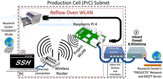 Labels 1–3 indicate the three different implemented strategies of cybersecurity: (1) Maintain data traffic from possibly “unclean devices” away from the reflow oven’s WLAN, by utilizing different NICs. (2) The wireless router managing the reflow oven WLAN follows the WPA2-PSK Security Standard and operates under a Whitelist. (3) The PrC Subnet is managed by a Phoenix mGuard Router, which runs the mGuard Firewall and enforces yet another Whitelist.