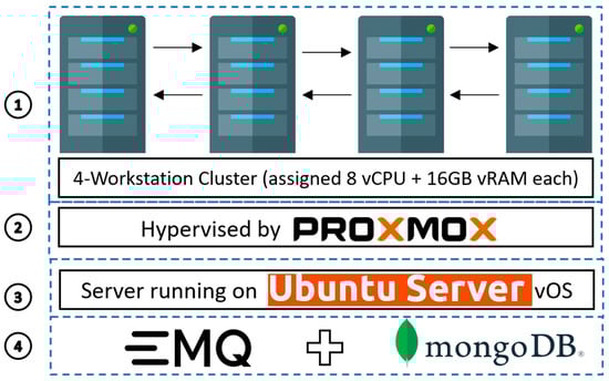 Labels 1–4 indicate the layers of the MQTT Server’s architecture. (1) Hardware: A workstation Cluster. (2) Virtualization Hypervisor: Proxmox assigns eight virtual nuclei of CPU and 16 GB of Virtual RAM from each workstation to the Clustered Virtual Machine running the Broker Services (3) OS: The Virtual Machine runs on the Ubuntu Server Virtual OS. (4) Services: EMQ and MongoDB.