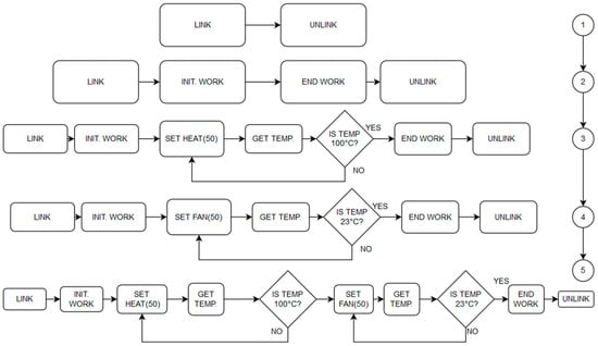 To attain confirmation that each command is, in fact, responsible for the attributed action, the commands were executed in a reciprocal “do-undo” method, as illustrated in Figure 10. Said diagram shows a gradual buildup, from the simplest commands (and their cancelling counterparts) to an actual temperature closed-loop control.