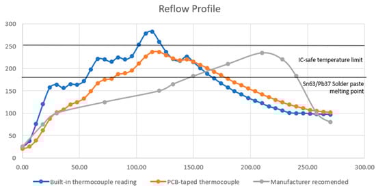 For future research, the improvement of temperature control precision and offset compensation are certainly major areas of opportunity. Figure 12 shows three different temperature profiles. The first one (blue plot) corresponds to the oven’s built-in thermocouple found in the workspace near the heating elements (which reports a higher, yet incorrect, temperature). The orange curve plots the temperature sensed by an additional thermocouple, taped directly onto the copper board (which indicates the actual copper board temperature). This dual-measurement setup was made to find the magnitude in which the workspace and workpiece temperatures differ and determine if this can serve as a niche for future research. Finally, the gray curve plots the recommended manufacturer heat profile.