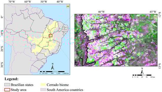 Location of the study area from the perspective of (a) South America, Brazil, Cerrado biome, and Bahia state and (b) landscape composition, with croplands, pasturelands, natural grasslands, and shrublands.