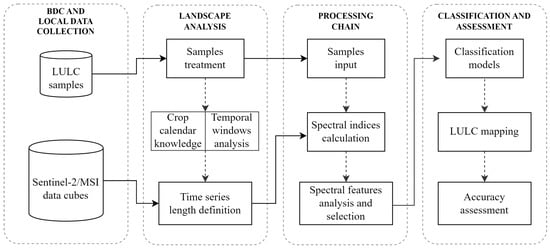 Information of this magnitude can be obtained via maps. Worldwide, highly accurate LULC classification has strategic value for reducing uncertainties and supporting the implementation of policies [3,4,5]. This context reinforces the need for detailed mappings [6]. Free and open access data, analysis-ready data (ARD), and high-performance computing created a new era for LULC analysis [7]. However, accurate LULC classification remains a challenge influenced by many factors [8]. Major factors are related to the use of time series for LULC classification at the regional or global level [9], algorithms and input data [8], requirements, user-defined parameters, and computational costs [10], Earth observation (EO) platforms and datasets, the spatial-spectral-temporal characteristics of satellite data, and approaches to change detection [11], web-based workflows [12], accurate spatiotemporal event detection [13], and estimation of the general and species-specific phenological stages [14]. The state of the art for extracting land surface information from remote sensing-based techniques indicates that LULC classifications are migrating from exclusively human-based to semi-automated approaches [14,15]. In this scenario, the use of multidimensional ARD and spectral vegetation indices (VIs) from medium-resolution EO images for detecting subtle differences in vegetation types and improving LULC classification can be automated. However, sample collection, which configures the semi-automated nature of many LULC classification approaches, remains a task that is difficult to automate.