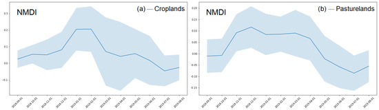 Time series derived from the samples of the (a) Croplands and (b) Pasturelands LULC classes in NMDI, showing the median profile in the blue line and all values in a blue shadow.