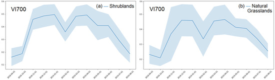 Time series derived from the samples of the (a) Shrublands and (b) Natural Grasslands LULC classes in the VI700, showing the median profile with a blue line and all values in a blue shadow.