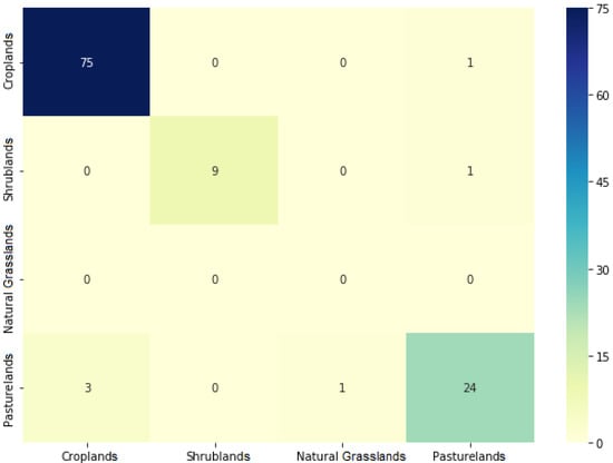The overall accuracy (OA) of the LULC classification was . Most of the errors were derived from confusion between Croplands and Pasturelands (especially in the western portion of the study area) as well as between Natural Grasslands and Shrublands (especially in the eastern portion of the study area). A plausible explanation, aside from the similarities in time series, is the uneven amount of samples used to train the RF algorithm in the semi-automated LULC classification approach. To represent the accuracy of individual classes, we also evaluated the producer (PA) and user (UA) accuracies of each class. Figure 7 presents the error matrix derived from the LULC classification.
