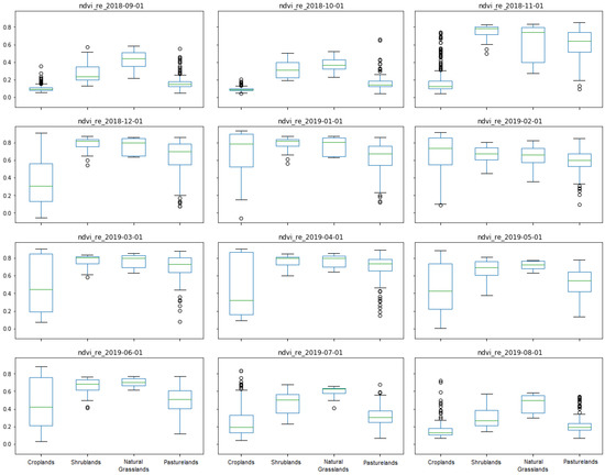Monthly boxplots of NDVIre (Figure 8), a VI representative of the others, showed the variability of the samples from each LULC class. Croplands and Pasturelands were the LULC classes with the higher variability, concentrating the higher presence of outliers.