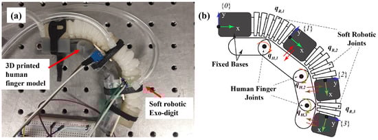 The physical interaction between a human finger and a soft-wearable robot is studied using a model of soft robotic exo-digit and a corresponding human finger model, as shown in Figure 1a. Continuous passive motion (CPM) therapy is the main application of this human-robot interaction. In CPM, the robot actively applies slow, repetitive motions to the user’s hand while the user is passive. Thus, the physical interaction can be modeled as a quasi-static process. The soft robotic exo-digit consists of three soft continuous actuating sections (i.e., half-bellow shape hollow structures) representing the joints of the soft-bodied robot and four semi-rigid blocks linked through those pseudo joints. The human finger is modeled as an articulated rigid multi-body with three revolute joints representing the metacarpophalangeal (MCP), proximal interphalangeal (PIP), and distal interphalangeal (DIP) joints of the human finger. Rotational (torsional) springs are integrated at each joint of the human finger model to replicate the biomechanical stiffness of the human joints. The torsional springs are selected from the vendor with a stiffness of N·m/deg, N·m/deg, and N·m/deg for MCP, PIP, and DIP joints, respectively. The semi-rigid links of the soft robotic exo-digit are attached to the links of the human finger model (as shown in Figure 1a), where the physical interaction occurs; see Figure 1b. Frames are attached to each soft-bodied link to describe the kinematic motion of each segment. The quasi-static interaction of the soft robotic digit and the human finger model were decoupled to derive the equations of motion (balance) for each body where the physical interaction (contact forces) is distributed along the length of the two bodies. It is assumed that the reaction force between the human finger and the soft robotic digit happens at the center of each link and is dominant in the direction normal to the soft-bodied links. Figure 2 shows the workspace of the human finger model and the soft exo-digit. In both cases, the joint angles range from 0–90° for MCP, 0–100° for PIP, and 0–70° for DIP, and the link length is measured by the distance from one joint to another. The biomechanical range of motion of a human finger served as the basis for setting these ranges.