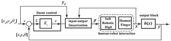 The goal is to find a coordinate transformation, and a feedback control to linearize Equation (12) for the mapping between the inputs and outputs for the trajectory tracking problem. Thus, , i.e., the trajectory tracking error, is selected where is the vector of the reference inputs (i.e., the desired outputs) which the human finger controlled by the soft exo-digit must follow. Given the discrete derivative of ,
