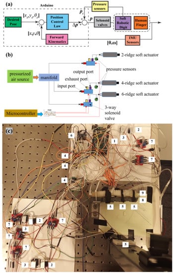 (a) Control system block diagram for pressure-based pose control and (b) schematics of the electro-pneumatic diagram with control components and (c) the actual control setup where each component labeled according to the corresponding number in Table 1.