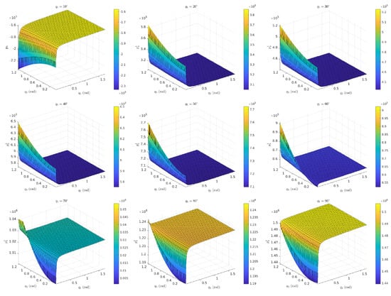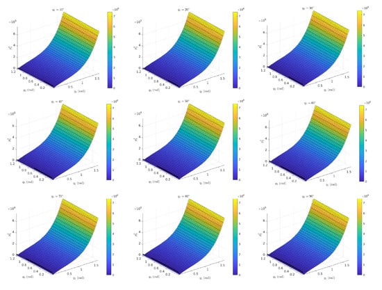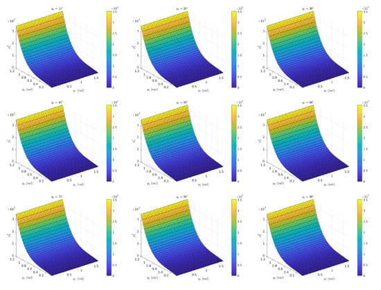 The determinant of is provided here, and the values of the determinant are obtained for the configuration space of the soft robotic exo-digit as illustrated in Figure A1 where the pseudo joint bending angles varied in the range of motion of the human finger joints. The results are presented for varying values of , while the surface demonstrates the variation of the determinant for variation and . Excluding the , which is the singularity of , the determinant stayed finite and there is a trend of increasing values towards the upper limit of and for the range of . As shown in Figure A1, after larger than , there is a discontinuity in the determinant manifold towards the upper limit and . The discontinuity is displayed on the 2D projection of the manifold in Figure A2. Despite the discontinuity,