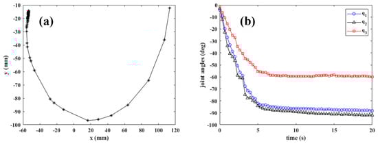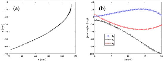 (a) The second desired trajectory of the tip of the human finger in the Cartesian space and (b) corresponding joint angles.