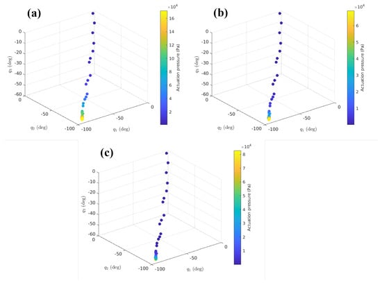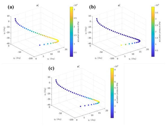 Variation of the controlled pressure of (a) the first soft actuator segment, (b) the second soft actuator segment and (c) the third soft actuator segment with respect to the configuration space of the soft robotic exo-digit in following the second desired trajectory (see Figure 10).