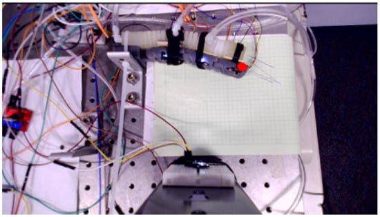A desired trajectory of a human fingertip is provided in the form of equations , , . With the given pose (x, y, ) of the fingertip, where each parameter varies with time, t, the three joint angles associated with the finger are calculated using inverse kinematics. The experimental setup includes an Arduino Mega 2560, four IMUs MPU6050 to measure the angular position of each joint in a human finger model, three MPRLS pressure sensors to measure the pressure buildup in three joints, three FA0520E three-way air valves to increase the pressure in each joint, three FA0520D two-way valves to release pressure from the joints, and six HM MOS modules for opening and closing the valves. An I2C Multiplexer (TCA9548A) is used to connect the pressure sensors and IMUs to the Arduino. The system is controlled by an Arduino program that adjusts the pressure applied to the joints to match the desired joint angles. The code starts by defining the output pins of the valves, reading the IMUs to obtain the joint angles, calculating the desired joint angles using inverse kinematics and comparing the actual and desired angles. If the desired angle is greater than the actual angle, the three-way valve of the joint opens to increase the pressure. If the desired angle is less than the actual angle, the two-way valve releases air from the joint, causing the red point in the fingertip, as shown in Figure 12, to move along the desired trajectory. Figure 13 depicts the joint angles for three joints (MCP, PIP, and DIP) and compares the actual angles with the desired angles for experiment-1. The outcomes reveal that the finger was able to accurately trace the desired joint angle for all three joints, with a root-mean-square error (RMSE) of 1.32, 1.46, and 0.86 degrees for each joint, respectively. The actual joint motions show an oscillating behavior around the desired joint trajectories. This behavior is due to the use of solenoid valves and a pulse width modulation (pwm) scheme for modulating the pressure of the soft actuators based on the presented control law. Replacing the solenoid valves with proportional valves, which operate with continuous opening and closing rather than pulsing, could help eliminate the chattering responses of the soft actuators. Additionally, the range of motion of the trajectory tracking can be increased by using a pressure sensor that measures in a higher range compared to the current sensors; the current pressure sensors in the control system measure in about the 0–70 kPa range, which led to a limited range of motion available for each soft actuator. Figure 14 demonstrates the expected and actual path of the fingertip as measured by both the IMU-based tracking and the camera. The IMU-based tracking uses the measured joint angles of the human finger and the forward kinematics equations to determine the fingertip pose. The picture confirms that the fingertip followed the desired path closely, with an RMSE of 7.49 mm in the x direction and 12.35 mm in the y direction for the camera measurement, 1.98 mm in the x direction, and 2.79 mm in the y direction for the IMU measurement. The deviation between the camera and IMU-based tracking is mainly due to the error of the camera software to accurately and consistently detect the exact location of the center of the marker attached to the fingertip.