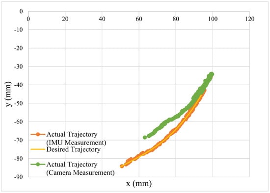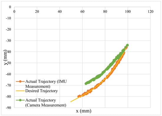 The experiment was repeated for the second time, and the results for the joint angle and the tip trajectory are shown in Figure 15 and Figure 16, respectively. The obtained results confirm the repeatability of the control algorithm and the hardware. Once again, the actual joint angles followed the desired joint angles with a low RMSE of 1.63, 1.60, and 0.92 degrees for each joint, respectively. The RMSE for the camera measurement was 6.77 mm in the x direction and 11.15 mm in the y direction, while for the IMU measurement, it was 2.55 mm in the x direction and 2.71 mm in the y direction. Note that the resulting RMSE for IMU-based tracking and the camera-based tracking are very close and consistent between the two cases.
