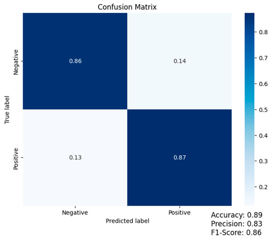 Confusion matrix (accuracy: 0.89; precision: 0.83; F1-score: 0.86).