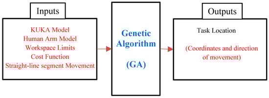 These constraints are found experimentally by moving the robot end-effector and the human arm model to their limits and selecting a subset of the cross-section of their workspaces. An overview of the proposed genetic algorithm used in the presented work with its inputs and outputs is illustrated as shown in Figure 3.
