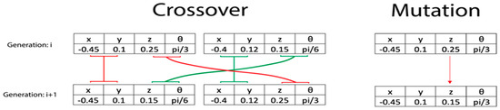 As presented in the previous paper [26], in the GA terminology, the first endpoint coordinates of the task and the angle are defined as genes, whereas the whole set composes a chromosome. A visual explanation for that process is shown in Figure 2. For these optimization parameters, real-time encoding is used. Their constraints in the workspace are chosen for the motion along the straight-line segment to be feasible for both the human and the robot. The optimization parameters’ constraints with respect to the inertial frame are: