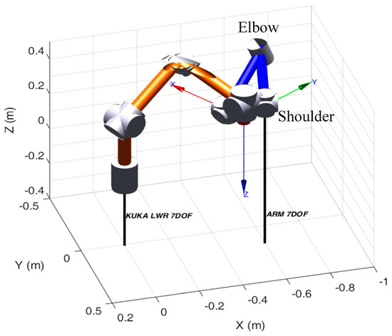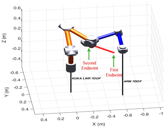 As shown in Figure 5, the manipulator with the blue color represents the human arm and the manipulator with the orange color represents the KUKA LWR robot. The axis of the handle movement along the determined best task location is marked in red. The motion starts from these configurations, which are presented in Figure 5, and in the direction of the positive axis (with respect to the coordinate system attached to the robot end-effector), and the robot handle travels for .