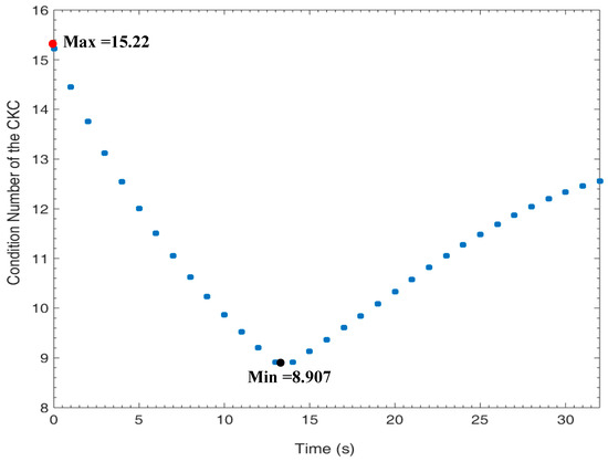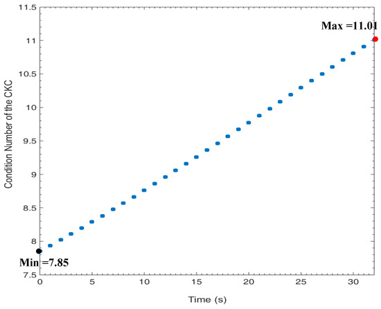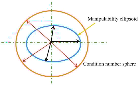 The condition number is a better measure of the degree of ill-conditioning of the manipulator than the manipulability index [25]. When the Jacobian loses its full rank, the minimum singular value is equal to zero; therefore, the condition number becomes infinity. In other words, the condition number is the measure of the kinematic isotropy of the Jacobian [41,42,43]. In [44], Asada and Granitio presented that isotropic configurations can be obtained by minimizing the condition number. The condition number does not have an upper bound, . Finally, the condition number is a good measure of the Jacobian matrix invertibility [45].