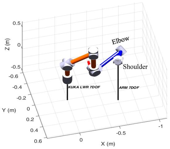 In Equation (1), and express the KUKA LWR model and the human arm, respectively. and are the Jacobian matrix for the KUKA LWR and the human arm, respectively. are the joints’ velocities for the KUKA LWR and the human arm, respectively.